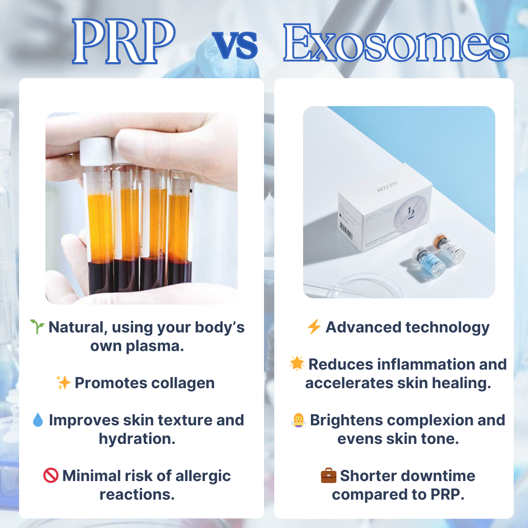 - Comprehensive Rejuvenation: PRP boosts collagen and elastin production for firmer skin and strengthens hair follicles, while exosomes target inflammation, hydration, and cellular communication for a balanced approach.