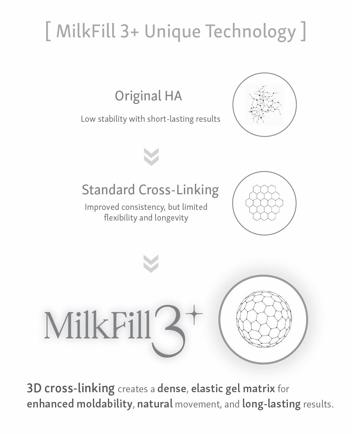 MilkFill 3+ is developed with advanced 3D Crosslinking Technology, creating a dense yet elastic HA gel structure that allows: