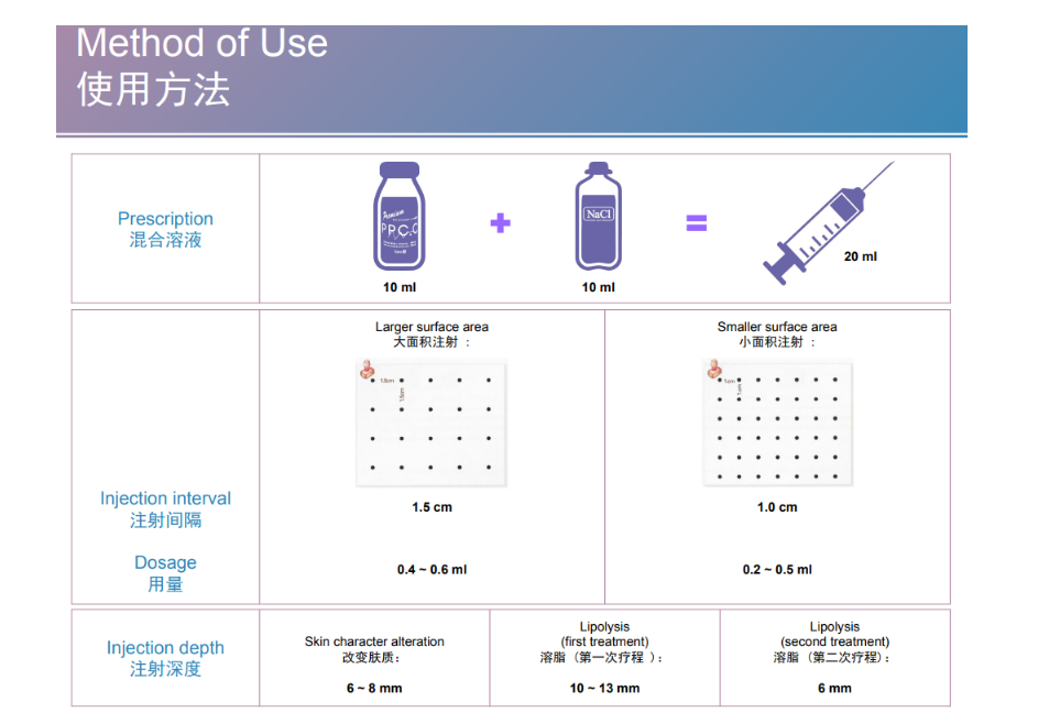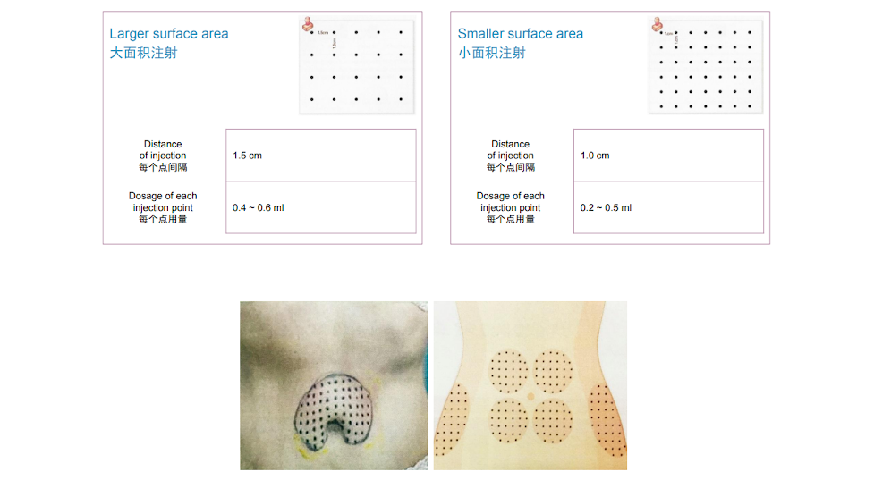 2. For a larger surface area, the injection interval between the points should be 1.5mm and the dosage should be0.4 ~ 0.6 ml. Instead, for the smaller surface area, the injection interval between the points should be 1.0mm and the dosage should be 0.2 ~ 0.5 ml