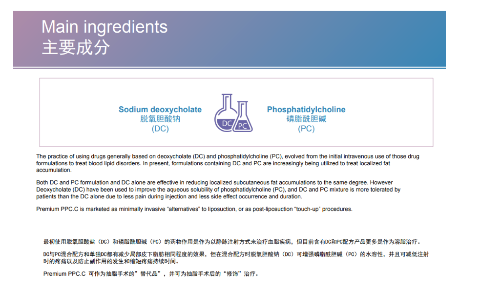 Thanks to its ingredients, Premium PPC.C is one of the best products among fat dissolvers. Premium PPC.C is recommended for all the patients that want to achieve great and long lasting results.