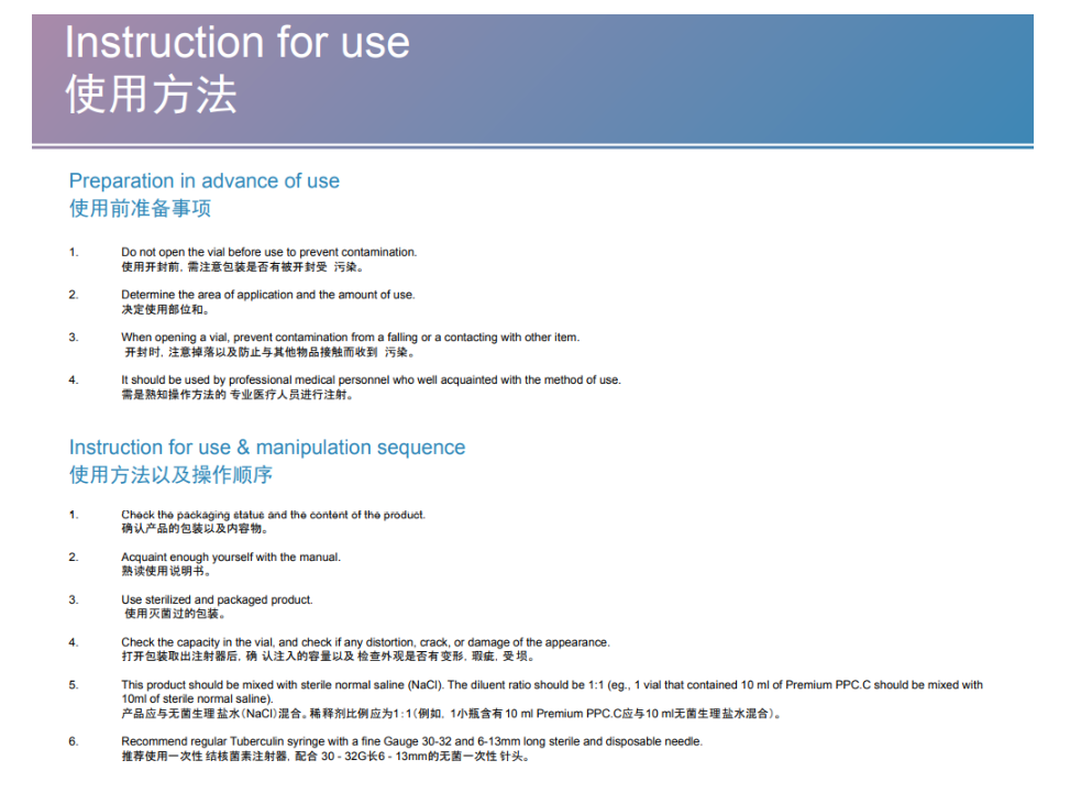 1. It is necessary to dilute 10ml of Premium PPC.C with 10ml of Saline Solution (NaCl) for a total of 20 ml