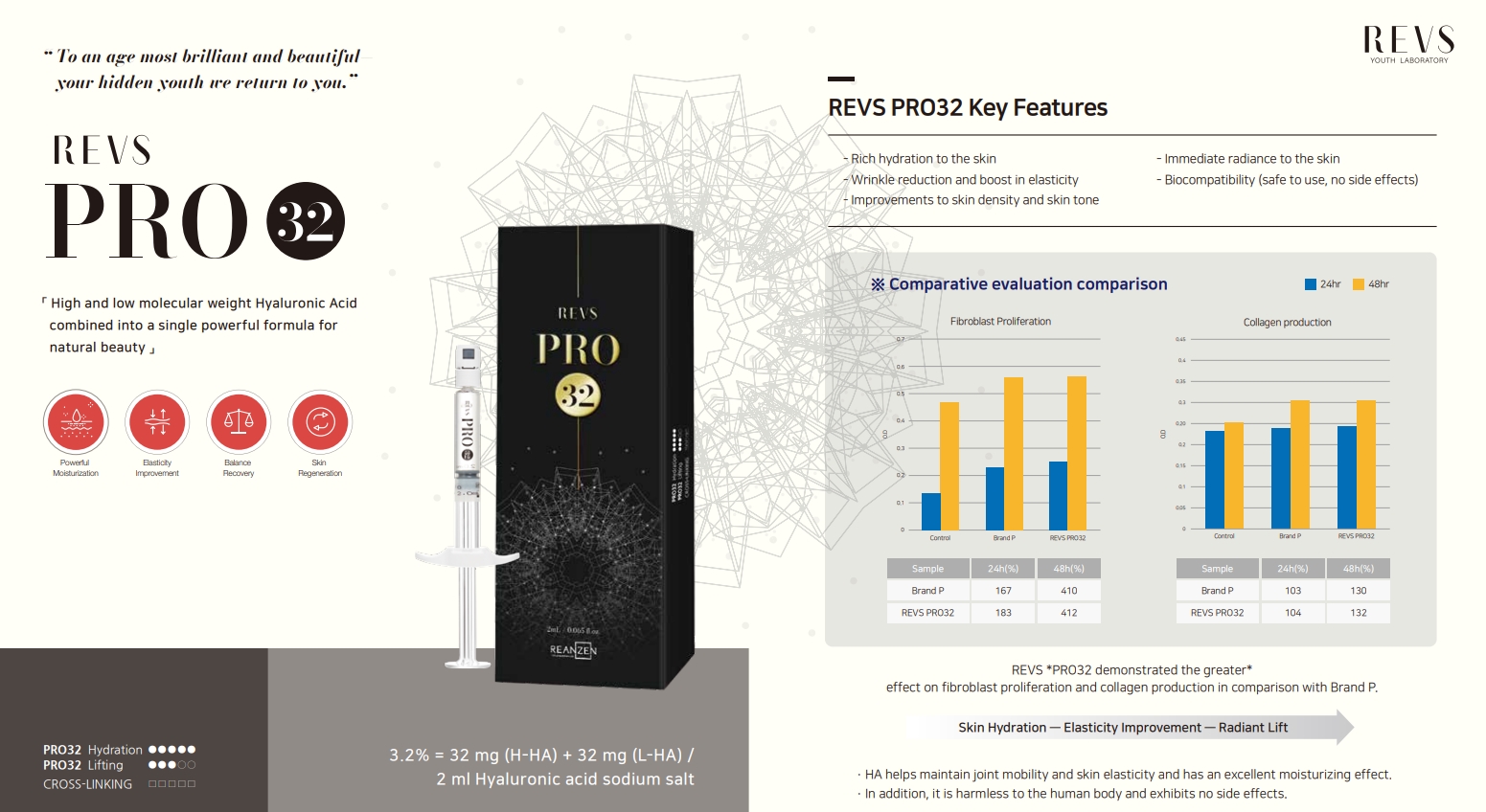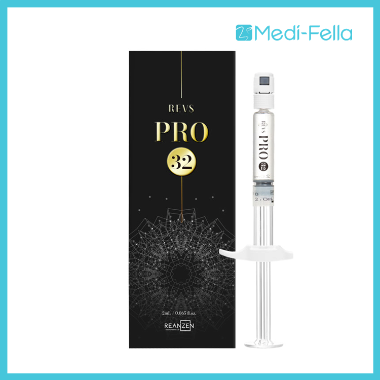 Revs Pro32 ensures wrinkle reduction other than overall improving skin density and tone. Furthermore, Revs Pro32 provides rich hydration to the skin. Thanks to its biocompatibility, Revs Pro32 is a safe product with almost no side effects. Moreover, Revs Pro32 has a great effect on fibroblast proliferation and collagen production, assuring skin hydration, elasticity improvement, and a radiant lift as a result of the treatment.