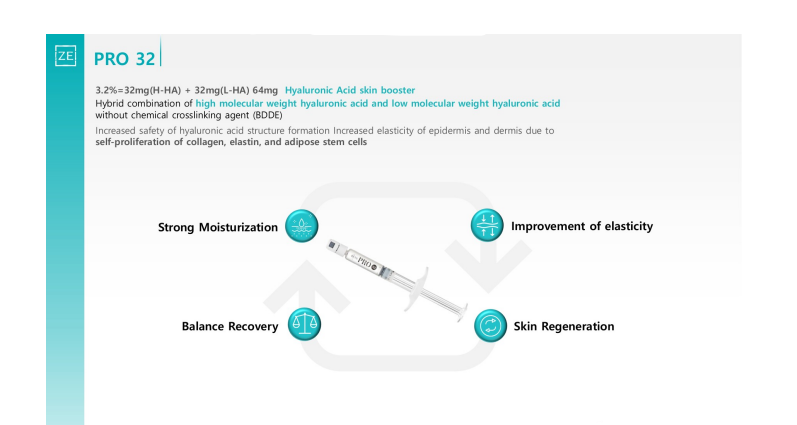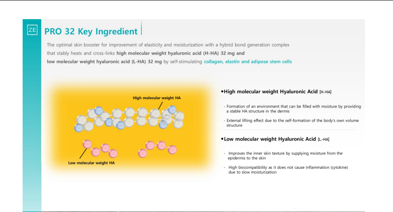 Ingredients: 32mg(H-HA) + 32mg(L-HA), 2ml of Hyaluronic acid sodium salt