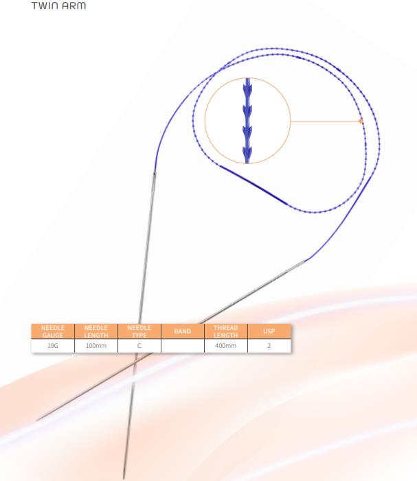 fiola Cog Molding Twin Arm can be inserted from both ends in all directions. This provides additional support to lift the skin and allows it to be strongly secured in the skin tissue. Twin Arm is inserted through a round and blunt needle to minimize tissue damage and reduce bruising and swelling.