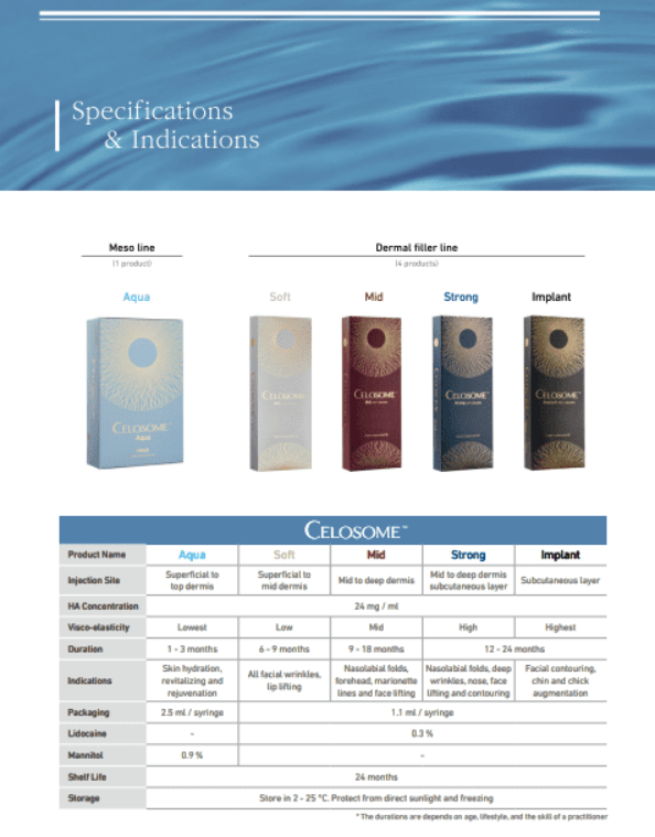 Celosome Mild Dermal Filler is designed for injection into the dermis layer. It is ideal for providing natural volume in facial areas like the fine wrinkles and lips. The aesthetic effects last for approximately 12 to 24 months, offering long-lasting satisfaction.