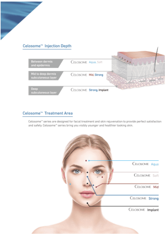 Celosome Implant Dermal Filler is designed for injection into the subcutaneous layer. It is ideal for providing volume and contouring in facial areas like the chin and cheeks. The aesthetic effects last for approximately 12 to 24 months, offering long-lasting satisfaction.