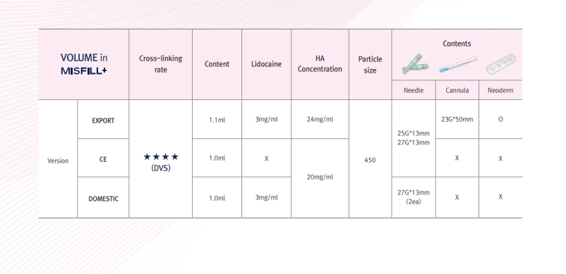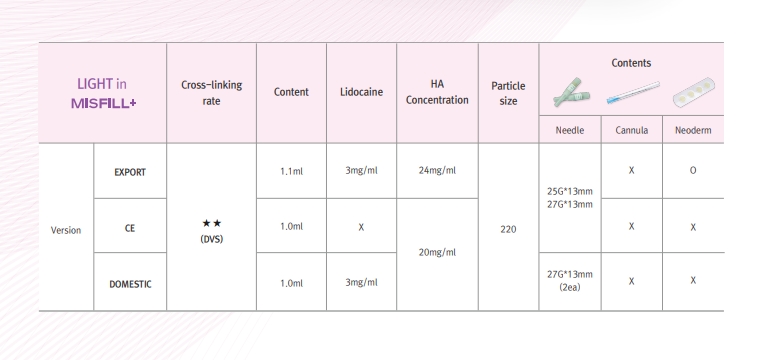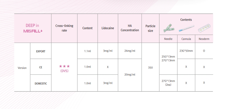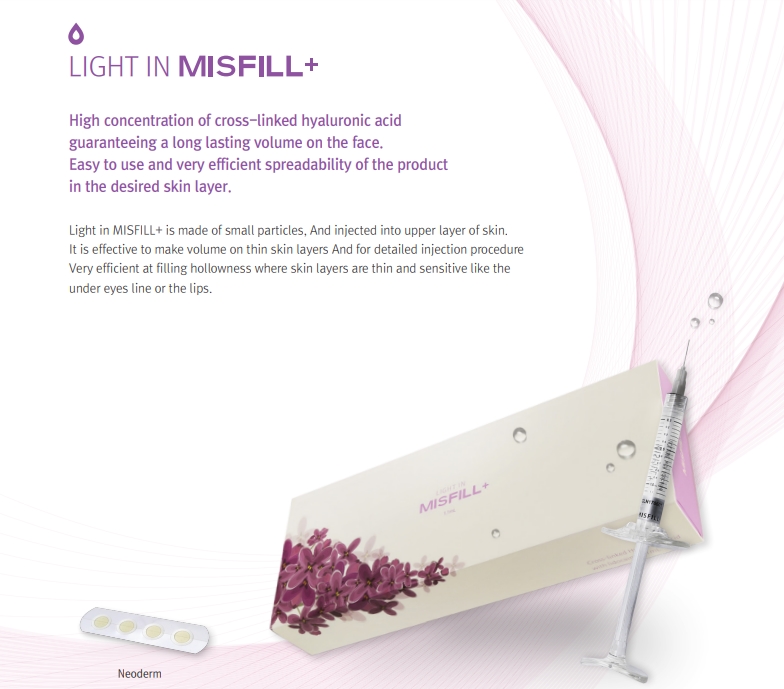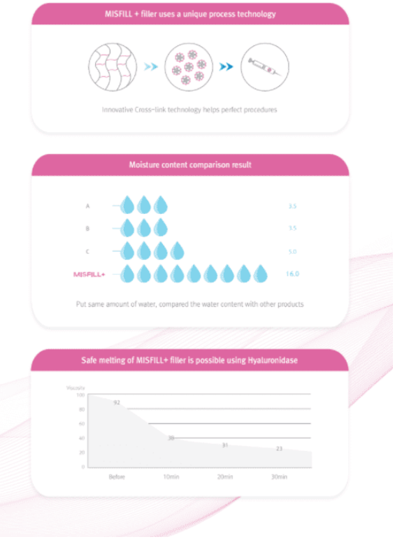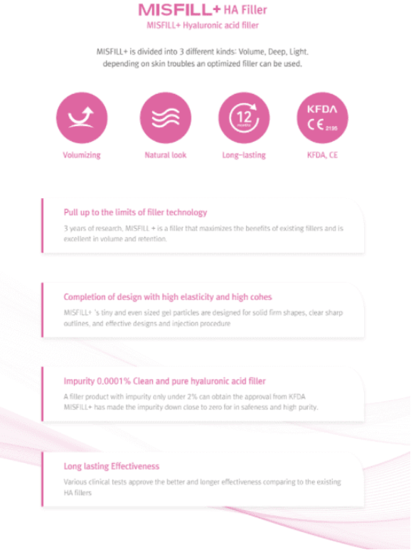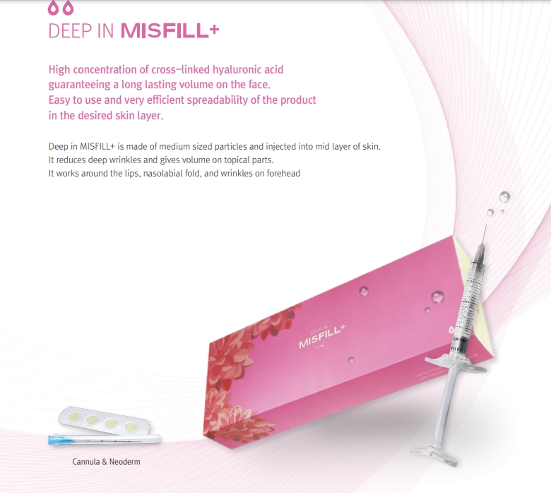 Misfill+ Deep Dermal Filler is highly recommended for its premium quality. After three years of research, it was developed to provide excellent volume and long-lasting results. Clinical tests have shown that Misfill+ Deep Dermal Filler outperforms other existing hyaluronic acid fillers in both longevity and quality. The filler particles are evenly sized, allowing for precise application that enhances facial contours and provides sharper, more defined shapes. Additionally, the product has higher moisture content and near-zero impurity levels, ensuring both safety and purity.