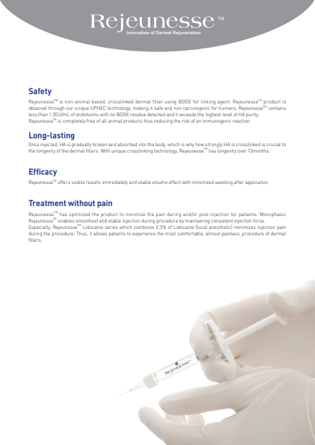 - Safe and High-Quality: With its non-animal hyaluronic acid, minimal endotoxins, and no BDDE residues, Rejeunesse Fine is a safe and reliable choice for patients.