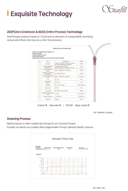 Starfill Plus dermal filler is a high-quality injectable developed with Zero Endotoxin and BDDE Entire Process (ZEEP) technology, ensuring minimal levels of residual toxins and cross-linking agents. This advanced manufacturing process enhances safety and reduces the risk of adverse reactions such as swelling, allergies, or other complications. The filler features uniform particle sizes, which ensure even distribution during application. Additionally, Starfill Plus contains Lidocaine to minimize discomfort during the procedure.