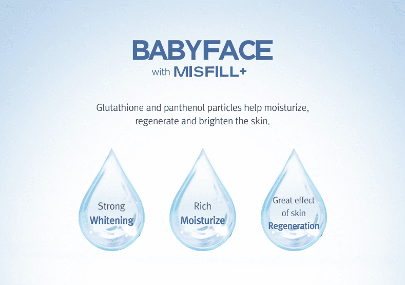 Thanks to the effects of Adenosine and Niacinamide, MISFILL+ BABY FACE helps to strengthen the skin cell self-vitality, while improving the skin’s immunity, showing great effects on wound healing. Furthermore, MISFILL+ BABY FACE has a natural whitening effect as it prevents melanin pigments from migrating to the epidermis. MISFILL+ BABY FACE recovers elasticity and moisturizes the skin, giving a youthful effect, and making the skin brighter.